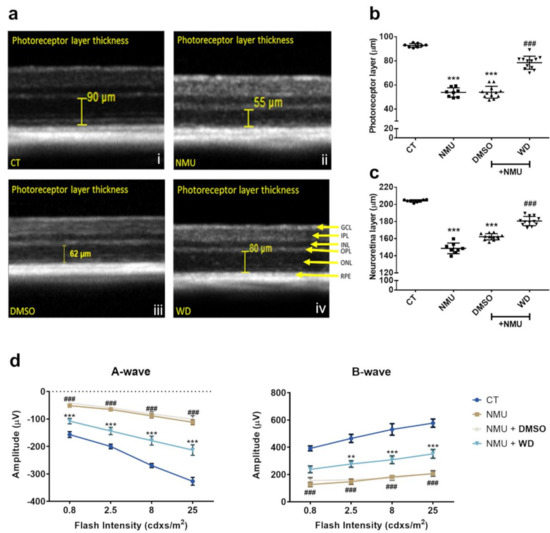 (a) Representative SD-OCT images derived from Heidelberg Spectralis software, displaying manual photoreceptor layer measurement (yellow measurement bar). (b) Quantitative analysis of the average photoreceptor layer thickness and (c) average neuroretina thickness was taken from four measurements (nasal, temporal, superior, and inferior) at 1500 µm eccentricities from the optic disk, per eye. CT: n = 8, NMU: n = 8, NMU + DMSO: n = 12, NMU + WD: n = 12; n = number of individual mouse eyes. One-way ANOVA with Tukey’s post hoc test. *** p < 0.001 comparison to CT. ### p < 0.001 comparison between NMU + WD and NMU + DMSO. (d) Analysis of A- and B-wave amplitude. The retinas from each experimental group were stimulated with increasing light intensities (0.8, 2.5, 8, and 25 cdxs/m2). CT: n = 6, NMU: n = 10, NMU + DMSO: n = 8, NMU + WD: n = 12; n = number of individual mouse eyes. Two-way ANOVA with Tukey’s post hoc test ** p < 0.01, *** p < 0.001 comparison between NMU + WD and NMU + DMSO. ### p < 0.001 comparison between NMU and CT. Error bars: mean ± SEM.