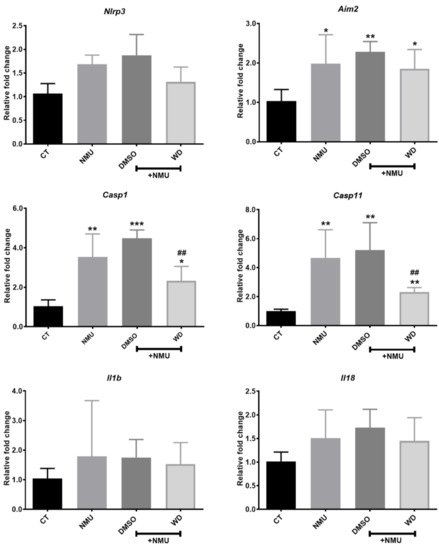 To understand the mechanism of WD-mediated photoreceptor protection, we investigated inflammasome activation in NMU-induced retinal neurodegeneration. RT-qPCR showed that Aim2, Casp11, and Casp1 were significantly upregulated in the NMU treated mouse retinas compared to those in the retinas from naïve control mice (Figure 2; p < 0.05). There was no significant change in the expression of Nlrp3, Il18, and Il1b mRNA in the NMU-treated mice (Figure 2). WD treatment significantly reduced the NMU-induced upregulation of Casp11 and Casp1 mRNA (Figure 2; p < 0.01) but did not affect the NMU-induced upregulation of Aim2 (Figure 2). The vehicle DMSO did not affect any of the NMU-induced upregulation of the inflammasome component (Figure 2). Western blotting was additionally carried out on several inflammasome components (data no shown); however, there was no statistical significance found between the individual proteins in the various treatment groups. Our results suggest that NMU-induced retinal inflammasome activation can be partly attenuated by WD at the mRNA level.