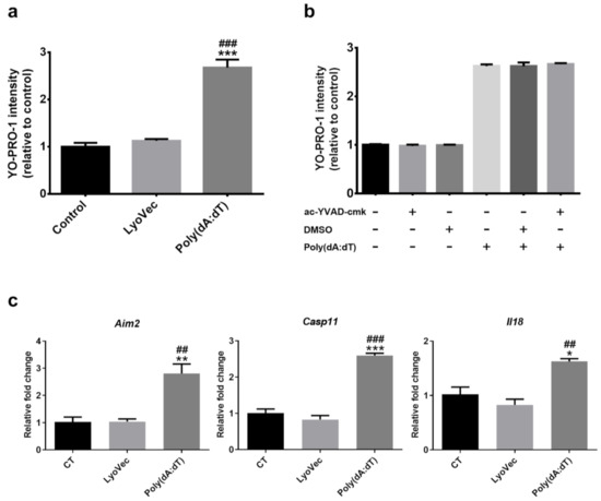 (a) 661W photoreceptor cells were incubated with Poly(dA:dT) or LyoVec (Poly(dA:dT) loading vector control), and (b) Poly(dA:dT) +/− ac-YVAD-cmk (100 µM) (Casp1 inhibitor) or DMSO (0.01%) for 8 h. The cell viability of 661W photoreceptor cells was determined by YO-PRO-1 uptake after 8 h of treatment. (c) Relative mRNA expression of inflammasome components in 661W photoreceptor cells after 8 h Poly(dA:dT) treatment, compared to the reference gene Actb. n = 3 per group; n represents the average of three experimental repeats. One-way ANOVA with Tukey’s post-hoc test. * p < 0.05, ** p < 0.01, and *** p < 0.001: comparison to the control. ## p < 0.01 and ### p < 0.001: comparison to LyoVec. Error bars shown as mean ± SEM.