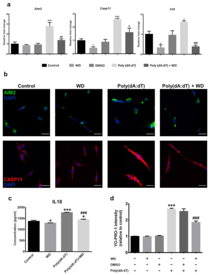 To understand if WD can protect photoreceptors from Poly(dA:dT)-induced death, we pre-incubated 661W cells with 50 µM of WD for 3 h prior to Poly(dA:dT) treatment. The RT-qPCR analysis showed that WD treatment significantly attenuated the Poly(dA:dT)-induced upregulation of Aim2, Casp11, and Il18 mRNA (Figure 4a). Immunofluorescent staining showed low levels of CASP11 (green) and AIM2 (red) expression in 661W cells under normal culture conditions (Figure 4b). Their expression was markedly enhanced by Poly(dA:dT), but not WD treatment (Figure 4b). Poly(dA:dT)-induced the upregulation of AIM2 and CASP11 was attenuated by WD pre-incubation (Figure 4b). IL18 was constitutively produced by 661W cells under normal culture conditions (Figure 4c). Poly(dA:dT) treatment significantly elevated IL18 production (p < 0.001), and this was attenuated by WD (Figure 4c; p < 0.001). WD alone sightly inhibited IL18 production (p < 0.05). WD on its own did not affect 661W cell viability (Figure 4d), however it significantly reduced Poly(dA:dT)-induced 661W cell death.