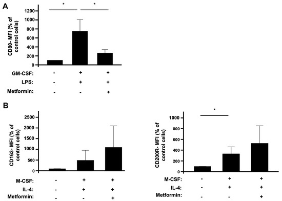 Figure 1. Effect of metformin on human isolated monocytes’ polarization into M1 and M2 macrophages. Human monocytes were isolated from blood of healthy donors and incubated in the absence or presence of metformin (2 mM) and GM-CSF (50 ng/mL) and LPS (100 ng/mL) for 7 days and analyzed by flow cytometry using fluorescent anti-CD14, anti-CD16, and anti-CD80 antibodies (A). Human monocytes were isolated from blood of healthy donors and incubated in the absence or presence of metformin (2 mM) and M-CSF (50 ng/mL) and IL-4 (20 ng/mL) for 7 days and analyzed by flow cytometry using fluorescent anti-CD14, anti-CD16, and anti-CD163 and anti-CD200R antibodies (B). Cell sorting and profiling was completed using a FACS Canto II cytometer and DIVA software for analysis. Data are mean of fluorescence (n = 3). * p value < 0.05.