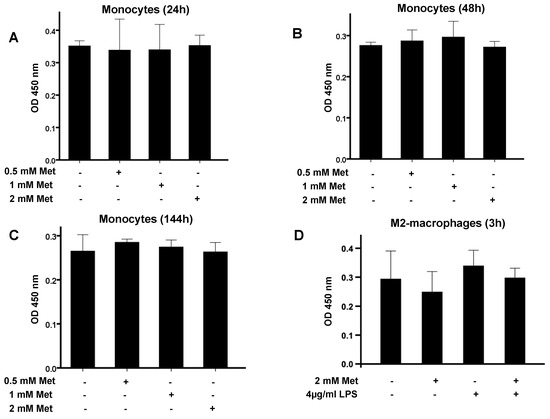 Figure 3. Evaluation of the cytotoxic effects of metformin on monocytes and M2 polarized macrophages. Human monocytes (AC) and M2 macrophages (D) were incubated in the absence or the presence of metformin (0.5, 1, and 2 mM) for different indicated time periods. Cytotoxicity was analyzed after the addition of cytoX reagent and measurement of absorbance at 450 nm. Data are mean of absorbance ± SD (n = 3).