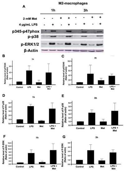 Figure 5. Effect of metformin on the phosphorylation of Ser345 of p47phox and its upstream MAP kinases, p38MAPK, and ERK1/2 in M2 macrophages. M2 macrophages were incubated in the absence or the presence of 2 mM metformin, then stimulated by LPS (4 µg/mL) for 1 and 3 h. The phosphorylation of Ser345-p47phox, p38MAPK, and ERK1/2 was evaluated compared to actin by SDS-PAGE and Western blot using specific antibodies (A). The pSer345-p47phox (B,C), p38MAPK (D,E), and ERK1/2 (F,G) and actin bands from three experiments were quantified and expressed as mean ± SD.