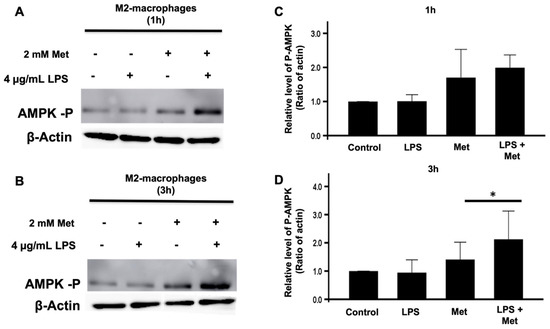 Figure 6. Effect of metformin on the phosphorylation of AMPK in M2 macrophages. M2 macrophages were incubated in the absence or presence of metformin (2 mM), then stimulated with LPS (4 µg/mL) for 1 (A) and 3 h (B). The phosphorylation of AMPK and the presence of actin were evaluated by SDS-PAGE and Western blot using specific antibodies. The corresponding bands for 1 hour (C) and 3 hours (D) from three experiments were quantified and expressed as mean ± SD (n = 3, * p < 0.05).