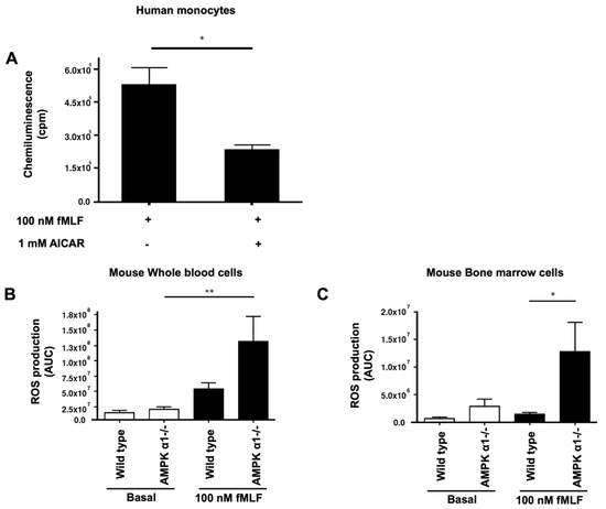 To investigate if, indeed, AMPK could inhibit ROS production in phagocytes, we first used 5-aminoimidazole-4-carboxamide ribonucleotide (AICAR), a known more potent AMPK activator than metformin [48,49]. We incubated human monocytes with 1 mM AICAR for 45 min and stimulated them with N-formyl-methionyl-leucyl-phenylalanine (fMLF), a potent inducer of ROS production. ROS production was measured by luminol-amplified chemiluminescence and results show that AICAR significantly decreased ROS production in fMLF-stimulated monocytes (Figure 7A). Second, and to further establish the association between AMPK and ROS production, we used whole blood cells and bone marrow cells collected from wild-type (WT) and AMPKα1-/- mice. Results show that blood cells and bone marrow cells from wild-type mice produced ROS in response to fMLF stimulation (Figure 7B,C). However, and most importantly, results show that blood cells and bone marrow cells from AMPKα1-/- mice produced a higher level of ROS in response to fMLF (Figure 7B,C). These results suggest that the activation of AMPK can block ROS production in cells and could explain the inhibitory effect of metformin on ROS production.