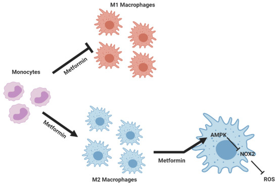 Figure 8. Schematic representation of metformin’s action on macrophage polarization, showing its anti-inflammatory and antioxidant effects on macrophages. Metformin inhibits the polarization of M1 macrophages while favoring M2 macrophages. In addition to this effect, metformin dampens ROS production by these cells. Metformin may exert its anti-inflammatory and antioxidant effects through the reduction in NOX2-induced ROS production in an AMPK-dependent manner.