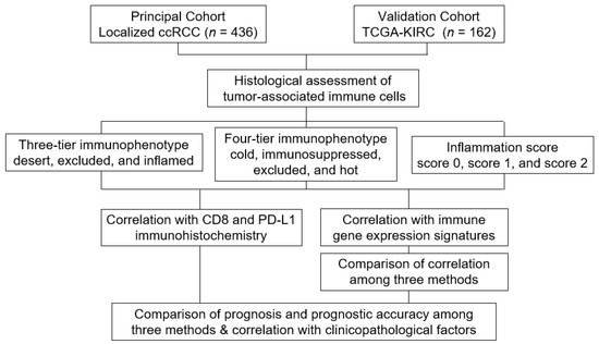 The current study aims to evaluate whether immunophenotypes of ccRCC, identified on hematoxylin and eosin (H&E)-stained slides, correlated with the gene expression signature related to cancer immunity, and clinical outcomes. In the present study, we first validated the histologic-based tumor-associated immune cells (TAICs) status using three methodologies: three-tier immunophenotype based on the location of TAICs, four-tier immunophenotype considering both the location and degree of TAICs, and inflammation score focusing only on the TAIC degree. Then, we correlated findings with CD8 and PD-L1 immunohistochemical expression and gene expression signatures related to cancer immunity by RNA-sequencing data available from the Cancer Genome Atlas (TCGA) [16,17]. Furthermore, we compared the correlation and prognostic accuracy among three methods and evaluated the association of histologic-based TAICs with pathological prognostic factors.