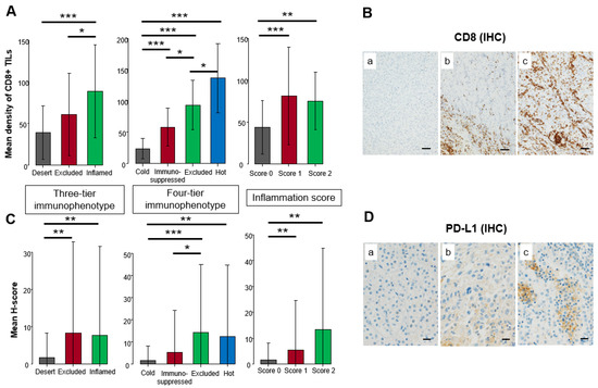 Comparison of immunohistochemical expression among three-tier and four-tier immunophenotype and inflammation score in the principal cohort. (A) Mean density of CD8+ tumor-infiltrating lymphocytes (TILs). (B) Representative example of CD8 immunohistochemistry (IHC). The brown color showed positive staining of immunohistochemistry whereas the blue color showed a counterstain of cell nuclei. (a). none, (b). CD8+ TILs accumulated in the peritumoral area, (c). CD8+ TILs infiltrated in the intratumoral area. Scale bar: 200 µm. (C) Mean H-score of PD-L1 expression on cancer cells. (D) Representative example of PD-L1 IHC. The brown color showed positive staining of immunohistochemistry whereas the blue color showed a counterstain of cell nuclei. (a). none, (b). focal weak positivity, (c). focal strong positivity. Scale bar: 20 µm. One-way analysis was used for statistical analysis (* p < 0.05, ** p < 0.01, *** p < 0.001 assessed by Mann–Whitney U-test).