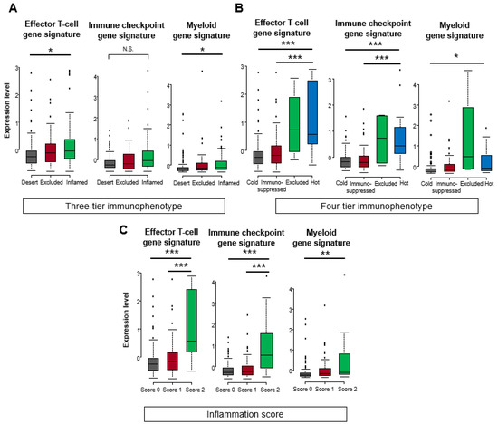 Comparison of gene expression signatures among three-tier and four-tier immunophenotype and inflammation score in the TCGA cohort. Comparison scores (mean Z-score) related to effector T-cell, immune checkpoint, and myeloid among (A) three-tier immunophenotype, (B) four-tier immunophenotype, and (C) inflammation score. Kruskal–Wallis test was used for statistical analysis (N.S. means not statistically significant. * p < 0.05, ** p < 0.01, *** p < 0.001 assessed by Mann–Whitney U-test).
