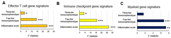 In the TCGA cohort, significant difference among the three scores were found in effector T-cell and myeloid gene signatures in the three-tier immunophenotype (both p < 0.05), whereas no significant difference was found in the immune checkpoint gene signature (Figure 4A). In the four-tier immunophenotype, effector T-cell and immune checkpoint gene signature was significantly enriched in hot and excluded compared to immunosuppressed and cold (p < 0.001). Furthermore, significant differences among the four types were found in the myeloid gene signature, with the highest expression of excluded (p < 0.05) (Figure 4B). In the inflammation score, the effector T-cell and immune checkpoint gene signature were significantly enriched in score 2 (p < 0.001), followed by score 1 (p < 0.001), and significant differences were noted among the three types in myeloid gene signature (p < 0.01) (Figure 4C). Correlation analysis among the three methodologies showed that the inflammation score was the highest in the effecter T-cell (f-statistic = 23.92, p < 0.001), immune checkpoint (f-statistic = 26.73, p < 0.001), and myeloid (f-statistic = 7.23, p = 0.008) gene signatures. Comparing the three-tier and four-tier immunophenotypes, the four-tier immunophenotype was higher in all gene signatures: effecter T-cell (f-statistic = 14.29, p < 0.001), immune checkpoint (f-statistic = 15.91, p < 0.001), and myeloid (f-statistic = 6.77, p < 0.001)), compared to the three-tier immunophenotypes (effecter T-cell (f-statistic = 3.48, p = 0.03), immune checkpoint (f-statistic = 4.08, p = 0.02), and myeloid (f-statistic = 1.59, p = 0.21) (Figure 5).