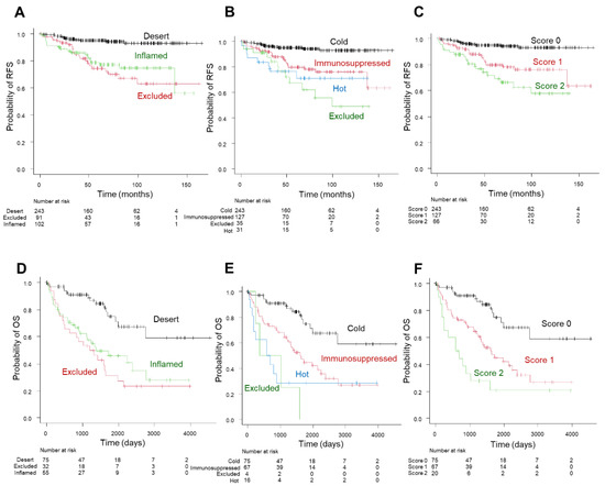 Prognostic significance of the three-tier and four-tier immunophenotype and inflammation score in the principal cohort (A–C) and TCGA cohort (D–F). Kaplan–Meier curve of recurrence-free survival (RFS) in the three-tier immunophenotype (A); four-tier immunophenotype (B); and inflammation score (C). Kaplan–Meier curve of overall survival (OS) in three-tier immunophenotype (D); four-tier immunophenotype (E); and inflammation score (F).