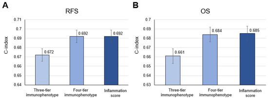 Comparison of accuracy among the three-tier and four-tier immunophenotype and inflammation score in (A) recurrence-free survival (RFS) and (B) overall survival (OS) in the principal cohort and the TCGA cohort, respectively.