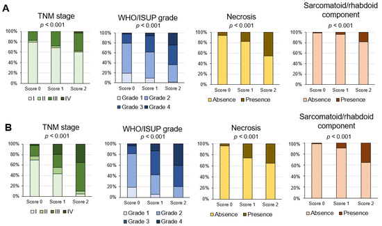 Considering both correlation analysis and the prognostic accuracy among the three methodologies, the inflammation score was the most correlated with the gene expression signatures (Figure 5) and prognostic prediction (Figure 7). Regarding the association of the inflammation score with TNM stage pathological prognostic factors, WHO/ISUP grade, sarcomatoid/rhabdoid components, and necrosis factors, significant differences among scores were found in both the principal and TCGA cohort (all p < 0.001; Figure 8A,B).