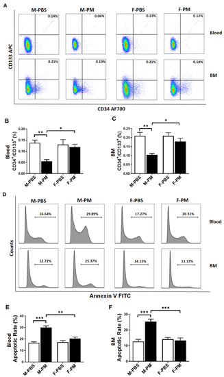 PM exposure selectively decreased EPC levels in blood and bone marrow with an increased apoptosis rate in male mice. (A) White blood cells were stained with CD133 APC and CD34 AF700 antibodies for flow-cytometric analysis of circulating (upper panel) or bone marrow (lower panel) EPCs (CD34+/CD133+), with summary data (B,C) demonstrating that PM exposure selectively decreased the EPCs populations in blood and bone marrow in male mice (n = 6). (D) Cells’ apoptotic rates of EPCs in blood and bone marrow as determined by flow cytometry analysis of Annexin V-FITC stained cells, with summary data for EPCs in blood (E) and in bone marrow (F) showing that PM exposure selectively increased EPCs apoptotic rates in male, but not in female, mice (n = 6). M-PBS: male mice with PBS treatment; M-PM: male mice with PM exposure; F-PBS: female mice with PBS treatment; F-PM: female mice with PM exposure. BM: bone marrow. * p < 0.05, ** p < 0.01 and *** p < 0.001.