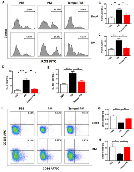 Tempol treatment preserved the EPCs in male mice with PM exposure. (A) Flow cytometry analysis was used to determine the ROS level in CD34+/CD133+ cells, with summary data showing that increased ROS production exposed to PM was blocked by Tempol treatment in the blood (B) and bone marrow (C). Elevated serum levels of pro-inflammatory cytokines IL-6 (D) and IL-1β (E) induced by PM were effectively prevented by Tempol treatment. (F) Flow cytometry analysis for circulating EPCs (CD34+/CD133+), with summary data showing that the PM exposure-induced decrease in the circulating EPC level in male mice was restored after Tempol treatment in the blood (G) and bone marrow (H). n = 5. PBS: male mice with PBS treatment; PM: male mice with PM exposure; Tempol-PM: male mice with PM exposure and Tempol treatment. BM: bone marrow. * p < 0.05, ** p < 0.01, and *** p < 0.001.