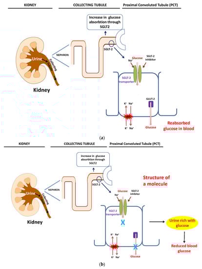 (a) Sodium-glucose co-transporter type 2 (SGLT2) inhibitor pathway. (b) Sodium-glucose co-transporter type 2 (SGLT2) inhibitor pathway.