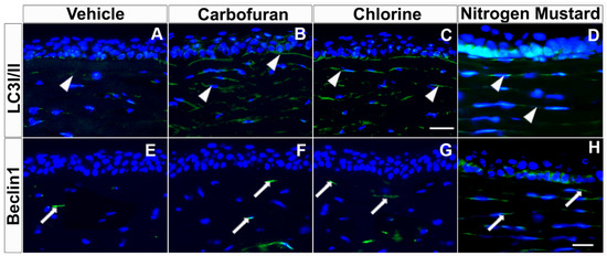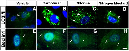 Carbofuran, chlorine, and nitrogen mustard gas upregulate the expression of autophagy in primary human corneal fibroblasts (hCSF). Immunofluorescence showing LC3I/II (A–D) and Beclin1 (E–H) expression. hCSFs which had been exposed to carbofuran (10 μM), chlorine (0.001% NaOCI) or nitrogen mustard gas (200 µM) showed markedly increased levels of Beclin 1 and LC3I/II as compared to vehicle controls. Scale bar = 25 µM.