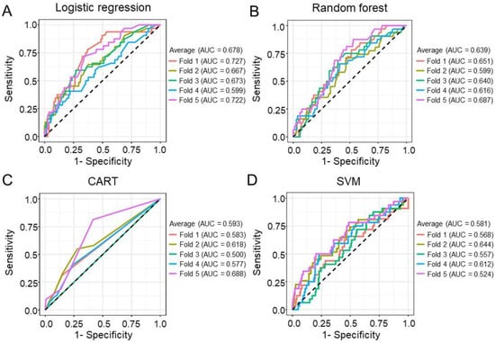 Prediction model with stratified five-fold cross-validation for cancer recurrence. (A) A logistic regression model was used to predict cancer recurrence with the highest average area under the curve (AUC) = 0.678. (B) A random forest model was used to predict cancer recurrence with an average AUC = 0.639. (C) Classification and regression decision trees (CARTs) were used to predict cancer recurrence with an average AUC = 0.593. (D) A support vector machine (SVM) was used to predict cancer recurrence with an average AUC = 0.581.