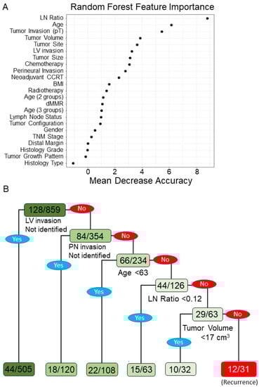 Prognostic factors in the random forest (RF) model and CART decision tree analysis. (A) The importance of factors in terms of the mean decrease in accuracy in the RF model. We ranked the relative importance for all these prognostic factors. From the results, the top five factors that corresponded to cancer recurrence were the lymph node ratio, age, depth of tumor invasion stage (pT), tumor volume, and tumor site. (B) A decision tree was generated by the CART model to optimize the risk stratification in cancer recurrence. The internal nodes of the tree represent prognostic factors, including lymphovascular (LV) invasion, perineual (PN) invasion, age, lymph node ratio, and tumor volume.