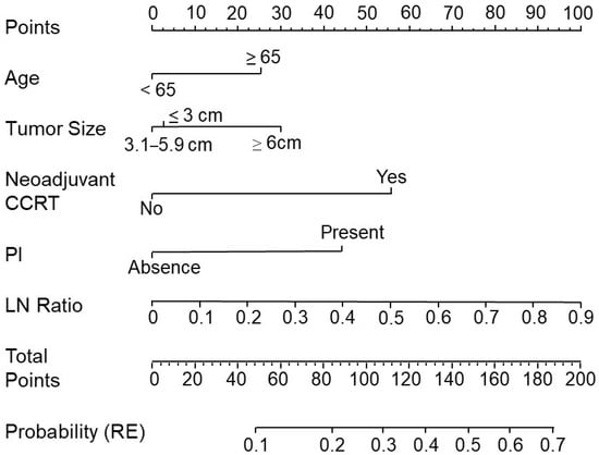 An established nomogram for predicting cancer recurrence. Nomogram incorporating clinical and pathological factors for predicting recurrence in patients with resected stage II–III CRC. There were five prognostic factors: age, tumor size, neoadjuvant chemoradiotherapy (CCRT), perineural invasion (PNI), and lymph node ratio (LNR). A straight line was drawn up to the points axis to determine how many points were associated with recurrence (RE). This process was repeated for each prognostic factor. The total points received for each prognostic factor are shown. From this, we calculated the probability of RE.