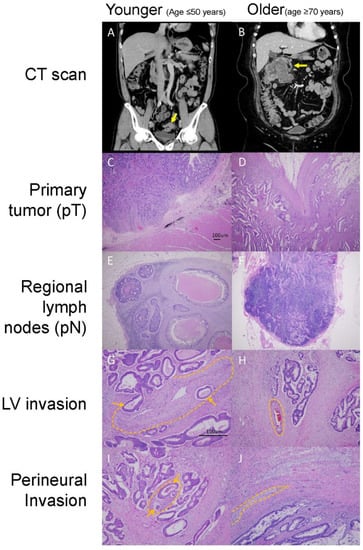An example of younger (age ≤ 50 years) and older (age ≥ 70 years) patients with distinct clinicopathological features present in computed tomography (CT) scans and tumor tissues stained with hematoxylin-eosin. CT scans of a (A) younger patient with sigmoid cancer with a size <3 cm and (B) an older patient with hepatic flexure colon cancer with a size ≥6 cm. Tumor tissues with (C) low-depth tumor invasion stage (pT1, 40×), (D) high-depth tumor invasion stage (pT3, 40×), (E) positivity for lymph node (LN) metastasis (40×) (F), no LN metastasis (40×), (G) positivity for lymphovascular (LV) invasion (100×), (H) no lymphovascular invasion (100×), (I) positivity for perineural invasion (100×), and (J) no perineural invasion (100×) are shown. Orange arrows and dotted lines highlight the invasive tumor cells in the vessels and nerves in the figure (G,I). The vessels and nerves in (H,J) (highlighted by dotted lines) are negative for tumor involvement.