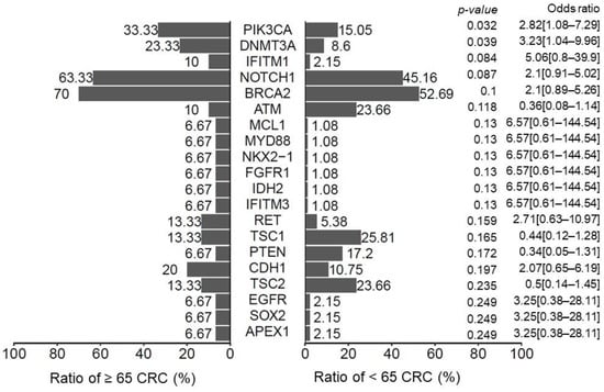 Histogram showing the percentage of genetic mutations in patients with CRC. We divided the patients into two subgroups: age ≥ 65 years and age < 65 years. The p-value was calculated using the Fisher exact test. In total, 30 (24.3%) patients were older than 65 years and PIK3CA and DNMT3A mutations were more prominent in these patients.