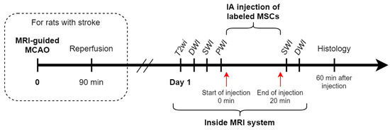 Rats (n = 10) were randomly divided into two experimental groups: (1) intact rats (n = 3) and (2) rats with experimental stroke modeling using transient 90 min tMCAO (n = 7, 1 of which was excluded from the experiment due to formation of a subarachnoid hemorrhage after surgery). IA transplantation of MSCs into rats with experimental stroke was performed 24 h after stroke modeling. The time window for transplantation, as well as cell dose of 5 × 105 in 2 mL of saline for all rats were chosen according to the results of our previous studies [7,23]. After insertion of the IA catheter into the external carotid artery, anaesthetized and ready for IA infusion rats were placed into the MRI scanner. The initial part of MR-examination included acquisition of the following MR sequences: isotropic T2-weighted images (T2wi) for estimation of brain anatomy and confirmation of lesion formation in case of stroke modeling, diffusion-weighted images (DWI), and susceptibility weighted images (SWI) for visualizing the original state of the brain before the injection of cells, and, finally, the selective intra-arterial perfusion study with bolus contrast injection. After the bolus contrast injection, 1 mL of saline was slowly manually injected to remove residual contrast from the catheter and 5 min pause was made to let the remnants of the contrast wash out from the brain. IA transplantation of MSCs suspension in 2 mL of saline was performed also inside the MRI scanner over a 20 min time period using the nanoinjector. The infusion parameters were selected based on our previous experiments [7,23] and literature data [6]. After the end of cell injection, the second part of the MRI was performed and the following MR sequences were obtained and compared with the results from the first part: SWI for visualization of the final distribution of SPIO-labeled MSCs, and DWI to exclude the possible embolic events. At the end of the second part of the MR-examination the rats were transferred back to the operating room and after removing the catheter and closing of the operating wound were euthanized as described above without regaining consciousness (approximately 1 h after the start of the IA transplantation). The transcardial perfusion was performed and the brains were removed from the skull to perform histological examination. The study design is schematically presented in Figure 1.