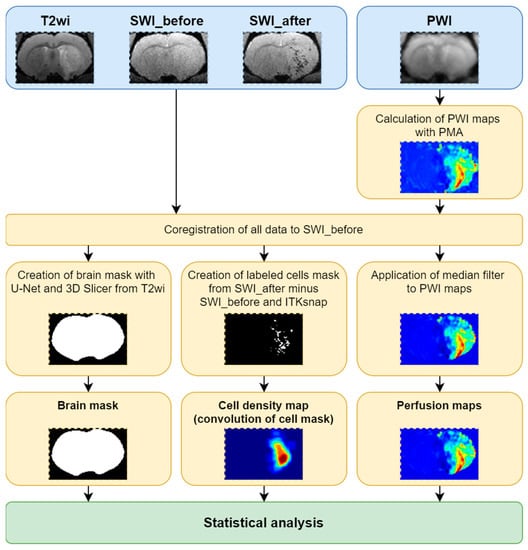 • The brain mask, cell distribution density map and filtered PWI maps were used for statistical analysis.