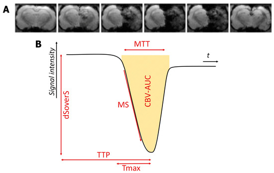 Figure 3. The example of dynamic T2*-weighted images of the perfusion study during selective intra-arterial contrast injection (A) and resulting perfusion curve with different quantitative parameters (B).