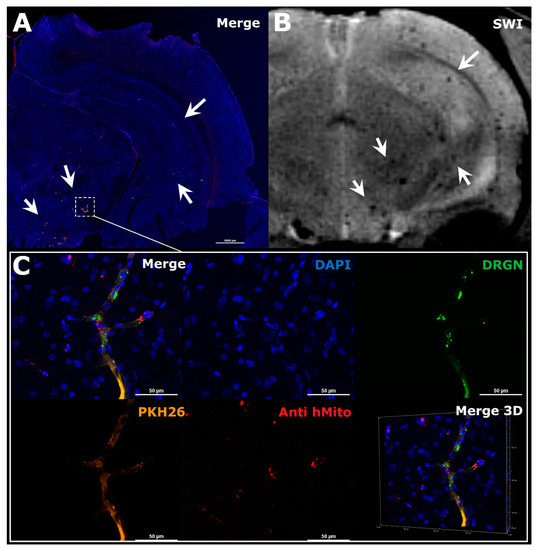 Figure 4. The comparison of MRI and histological images of the rat brain after IA administration of MSCs. The example illustrated the distribution of MSCs in the right hemisphere of the ischemic rat brain during the first hour after transplantation. (A) Panoramic confocal fluorescence image of the coronal sections of rat brain 1 h after MSCs’ transplantation. White rectangle and arrows indicate zones of labeled cell location. Before transplantation human MSCs were double-labeled with membrane lipophilic dye PKH26 (orange) and SPIO microparticles conjugated with fluorescent marker Dragon Green with cytoplasmic accumulation (green). Additionally, transplanted cells were stained using antibodies against human mitochondria (red). The nuclei were stained with DAPI (blue). Scale bar: 1000 μm. (B) SWI of the same rat brain 30 min after IA injection, white arrows indicated hypointense spots of SPIO-labeled cells accumulation. MRI data on cell distribution coincide with the histological study. (C) High-magnification confocal fluorescent images of the rat brain from the zone marked by the rectangle in A. Transplanted double-labeled MSCs were located inside cerebral blood vessels 1 h after IA transplantation (PKH26–orange, SPIO microparticles with fluorescent marker Dragon Green–green, MSCs stained using antibodies against human mitochondria–red, nuclei stained with DAPI–blue). Scale bars: 50 μm. Bottom right: 3D-reconstruction of z-stacks.