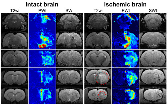 Figure 5. MRI data of rat brain of intact animal (left column) and rat with experimental stroke (right column). In the columns five sequential coronal brain sections visualized using different pulse sequences are presented: T2 weighted images before MSCs transplantation for visualization of brain anatomy and ischemic lesion (the hyperintense zones marked with red circle); perfusion map (CBV-AUC) obtained after injection of gadolinium-based contrast agent through the right ICA before cell administration; SWI 20 min after the start of IA transplantation of labeled MSCs through the right ICA for visualization of transplanted cells distribution. SPIO labeled cells are hypointense (dark) spots on SWI. In both intact and ischemic rat brains mild similarity between the location of the areas with high levels of cerebral perfusion and areas of SPIO-labeled cells accumulation is observed.