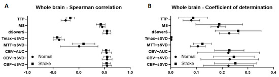 Figure 6. Correlation between different brain perfusion parameters and cell density in a whole brain for rats with stroke and intact animals. (A) graphs of Spearman correlation coefficients between perfusion maps and cell density; (B) graphs of coefficient of determination show the variability of the cell density that can be predicted from the perfusion maps. Graphs present mean values with standard deviations.