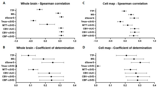 Figure 7. Correlation between different brain perfusion parameters and cell density in the whole brain (A,B) and in the places of their accumulation (C,D). (A,C)—graphs of the Spearman correlation coefficient between perfusion maps and cell density; (B,D)—graphs of the coefficient of determination show the proportion of the cell density that can be predicted from the perfusion maps.
