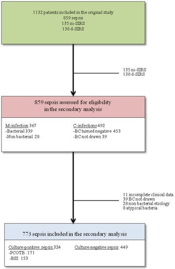 A secondary analysis was performed using data from the “Need Speed Study” database [18], which was a multicenter prospective study that aimed to derive and validate a predictive algorithm that could robustly differentiate sepsis from non-infectious systemic inflammatory response syndrome (ni-SIRS) at ED admission. The original study was conducted from 15 March 2013 to 15 March 2015. A total of 1132 patients with suspected sepsis fulfilling the Sepsis-2 criteria were enrolled in 5 Italian EDs. In brief, at the end of clinical work-up or death, patients were categorized as having sepsis, ni-SIRS, or debatable SIRS (d-SIRS). The source, etiology, and severity of sepsis were adjudicated according to a pre-defined classification system (see Supplementary Materials). The following cohorts were excluded from this sub-analysis: ni-SIRS, d-SIRS, septic patients with incomplete clinical data, septic patients in whom at least two sets of blood cultures were not drawn at ED admission, patients with a diagnosis of non-bacterial sepsis, and patients with a diagnosis of sepsis due to atypical bacteria originating from the lower respiratory tract (Figure 1).