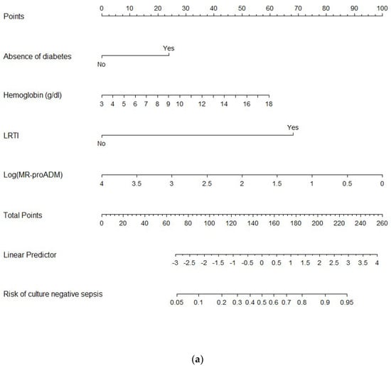 The median concentrations of all the biomarkers, except lactate and sTREM-1, were lower in CnS than in CpS (Table 1); after correction for covariates, only MR-proADM was independently correlated with culture-negative status (see Table S2). MR-proADM and the other independent predictors of CnS (absence of diabetes, hemoglobin concentrations, and the lower respiratory tract as a source of infection) were used to build the nomogram (Figure 2a).