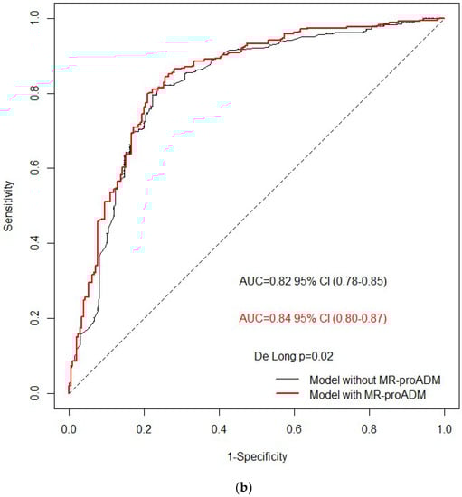 We built a nomogram to predict the pre-test probability of CnS in patients with a definitive diagnosis of sepsis at ED admission (Figure 2a). It’s AUROC was satisfactory (0.84) but far from perfection. The addition of MR-proADM improved the performance of the nomogram based only on the clinical variables (AUROC 0.82, p = 0.02). However, even if the nomogram was enriched with MR-proADM, it exhibited low sensitivity, specificity, NPV, and PPV for CnS (0.80, 0.79, 0.71, and 0.86, respectively; Table S3). Further studies are needed to derive and validate a clinical prediction rule that could robustly rule in/out culture-negative status in septic patients when the results of the cultures are not yet available.
