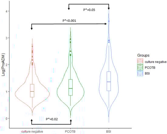 Correlation between median MR-proADM concentrations and the three cultural statuses (violin plot): culture-negative sepsis, sepsis with positive cultures other than blood (PCOTB), and bloodstream infections (BSI).