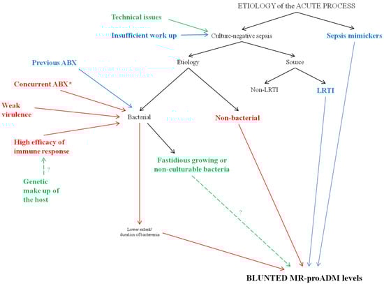 Motivations of culture-negative status: the hypothetical size of their impact on the genesis of culture-negative sepsis in this study. List of abbreviations: ABX: antibacterial therapy, LRTI = lower respiratory tract infection, MR-proADM = mid-regional proadrenomedullin. Size of the impact: red = high-moderate, blue = low, and green = unknown. * = according to previous studies [3,4,5].