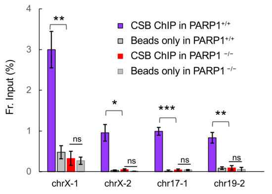 - Boetefuer, E.L.; Lake, R.J.; Dreval, K.; Fan, H.Y. Poly(ADP-ribose) polymerase 1 (PARP1) promotes oxidative stress-induced association of Cockayne syndrome group B protein with chromatin. J. Biol. Chem. 2018, 293, 17863–17874. [Google Scholar] [CrossRef] [PubMed] [Green Version]