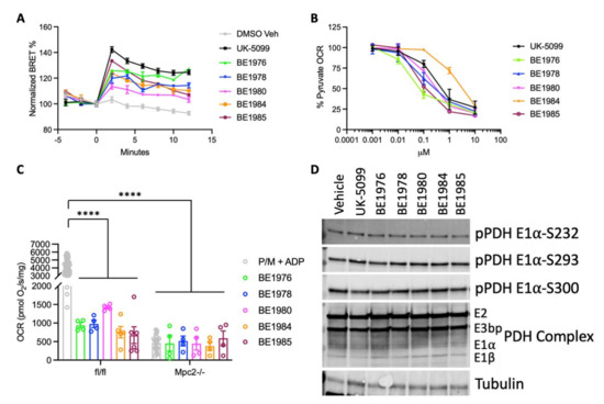 (A) Bioluminescent resonance energy transfer (BRET) activity in cells expressing WT mitochondrial pyruvate carrier (MPC) BRET constructs. Dimethyl sulfoxide (DMSO) vehicle or compound was added at time 0. An increase is signal is indicative of binding and MPC conformational change. (B) Oxygen consumption rates (OCR) of isolated heart mitochondria with pyruvate, malate, and adenine diphosphate (ADP), in response to increasing concentrations of UK-5099, BE1976, BE1978, BE1980, BE1984, or BE1985. (C) OCR of WT and cardiac MPC2−/− mitochondria respiring on pyruvate, malate and ADP without, and after addition of inhibitor compounds. (D) Western blot images of phosphorylated pyruvate dehydrogenase (PDH) E1α and PDH complex in lysates from isolated primary hepatocytes after 20-min treatment of either DMSO vehicle or 10 μM inhibitor compounds. Data presented as mean ± S.E.M. Analyzed by two-way ANOVA with Tukey’s correction for multiple comparisons (**** p < 0.0001).