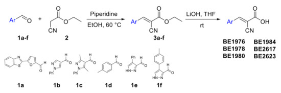To validate the ability of identified compounds to inhibit MPC, we again used the BRET-based system that is sensitive to pharmacologic inhibitors of the MPC. We were delighted to find that five compounds (BE1976, BE1978, BE1980, BE1984, and BE1985) increased BRET activity, indicating a direct interaction (Figure 6A). The identification of these new non-indole inhibitors increases the chemical space around this scaffold and provides opportunity for drug design. Four of the five active compounds were synthesized in-house for further confirmation (see experimental section). Knoevenagel condensation of the appropriate aldehyde (1a–f) with 2-cyanoacetate (2) to form arylidenecyanoacetic acid ethyl ester (3a–f) followed by saponification using LiOH leads to the formation of BE1976, BE1978, BE1980, and BE1984 (Scheme 1). Two more derivatives BE2617 and BE2623 were synthesized and showed activity in the BRET assay. These two compounds were synthesized to explore the activity of 1H-pyrazol-3-yl as a core heterocycle vs. 1H-pyrazol-3-yl in BE1978, BE1980, and BE1985.
