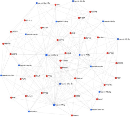 Other miRNAs that are specifically dysregulated in QNBC have been recently discovered. QNBC was found to exhibit increased expression of miR-135b, which correlated with AR-negativity among TNBCs [58]. Differentially expressed miRNAs were screened by array analysis and confirmed by RT-qPCR in tumors of both basal-like and non-basal-like (QNBC) TNBC subtypes. MiR-135b was suggested to promote QNBC pathogenesis and to be associated with the targeting of TGF-β, WNT and ERBB signaling pathways. MiR-135b expression was strongly and positively correlated with a high proliferative index. A recent study of African American women with QNBC by Angajala et al. identified differentially expressed miRNAs associated with the disease [59]. This study compared TCGA miRNA sequencing results from women with QNBC, AR+ TNBC, luminal and Her2+ breast cancers. Hsa-mir-500a, hsa-mir-181a-2, hsa-let-7d, hsa-mir-92a-2, hsa-mir-150, hsa-mir-17, hsa-mir-92a-1, hsa-mir-30a, hsa-mir-210, hsa-mir-455, hsa-mir-130a and hsa-mir-20a were found to be differentially expressed in QNBC with hsa-mir-135b, hsa-mir-18a and hsa-mir-577 being both differentially regulated and correlated with AR expression in QNBC. Our network analysis of these miRNAs reveals common regulatory nodes representing targetable molecules and pathways, including the Myc oncogene and TP53 and PTEN tumor suppressors (Figure 2). All three are regulated by miR-20a-5p, miR17-5p and miR92a-3p at the center of the network. Such miRNAs and their targets and similar analyses may provide novel targetable miRNA networks for the treatment of AR-positive TNBC and QNBC.