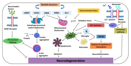 To date, more than 20 disease-causing genes and 90 separate risk-associated variations have been linked to PD []. Approximately 5–10% of patients have forms of the disease caused by mutations in these genes. At least 11 autosomal dominant genes, including SNCA, PARK3, UCHL1, LRRK2, and VPS35, and nine autosomal recessive genes, including PRKN, PINK1, PARK7, and DJ-1, have been identified []. Among the genes known to be associated with PD pathology, the most common and sophisticatedly linked genes are SNCA, LRRK2, PRKN, PINK1, and GBA1. It has been reported that the overexpression of α-Syn protein, which is encoded by the SNCA gene in humans, causes DA neuronal degeneration []. The dopamine storage was also found to be impaired by different mutations in the same gene, including A53T, A30P, and E46K. These mutations are the main reason behind the aggregation of Lewy bodies (LBs) causing DA neuronal death in the substantia nigra pars compacta (SNpc) []. Oligomers of α-Syn proteins can further activate the toll-like receptor 2 (TLR2) signaling pathway and eventually trigger microglial activation, resulting in neuroinflammation []. Several inflammatory mediators such as complement cascade proteins, cytokines including tumor necrosis factor-alpha (TNF-α), interleukin (IL)-1β and IL-6, chemokines, reactive oxygen species (ROS), and reactive nitrogen species are also released in this process. Normally, neurotrophic factors hinder α-Syn protein misfolding. However, due to the dependent depletion of these growth factors in PD, accumulation and aggregation of α-Syn proteins increase inside the nerve cells [].