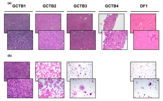 - Yoshimatsu, Y.; Noguchi, R.; Tsuchiya, R.; Ono, T.; Sin, Y.; Akane, S.; Sugaya, J.; Mori, T.; Fukushima, S.; Yoshida, A.; et al. Establishment and characterization of novel patient-derived cell lines from giant cell tumor of bone. Hum. Cell 2021, 34, 1899–1910. [Google Scholar] [CrossRef] [PubMed]