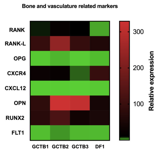 Heat map comparison of the relative gene expression of bone- and vasculature-related markers in GCTB and DF tumor tissue compared to the matched healthy tissue.