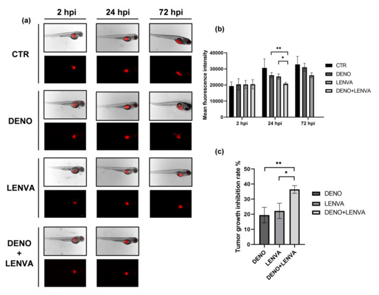 (a) Representative fluorescence microscopy images of zebrafish embryos xenotransplanted with DF1. Images of embryos untreated and exposed to DENO, LENVA and DENO + LENVA at 2, 48 and 72 hpi, scale bar 1000 μm. (b) Mean fluorescence signal of DF1 xenotransplanted embryos, arbitrary units. (c) Tumor-growth inhibition rate between tested drugs. Significant differences among treatments were accepted for p < 0.05 (*) and p < 0.001 (**).