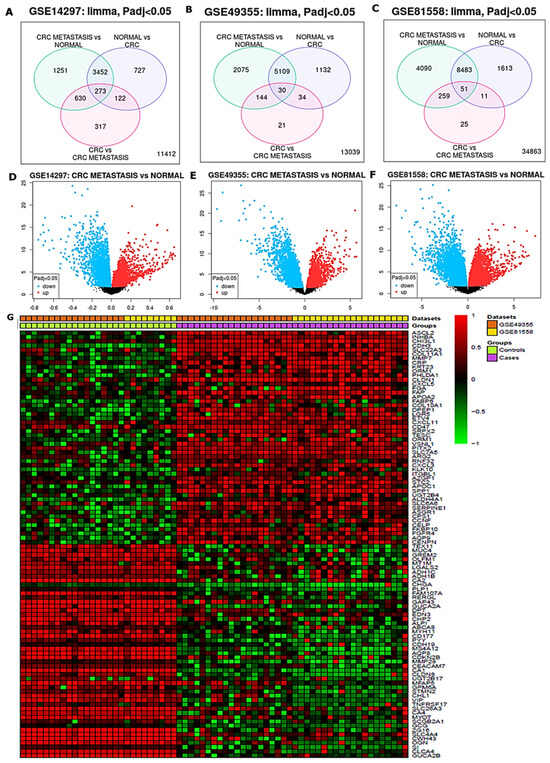 Differentially expressed genes (DEGs) in liver metastatic colon adenocarcinoma (CRC), primary CRC and normal sample, all obtained from GSE14297, GSE49355 and GSE81558 datasets. (A–C) Venn diagram showed 273, 30 and 51 overlapping upregulated genes from the above three databases, respectively. (D–F) volcano plots showing upregulated (red) and downregulated (blue) from metastatic samples as compared normal samples, respectively (G) shows the heatmap of overexpressed overlapping genes. with p-value < 0.05 considered statistically significantly.