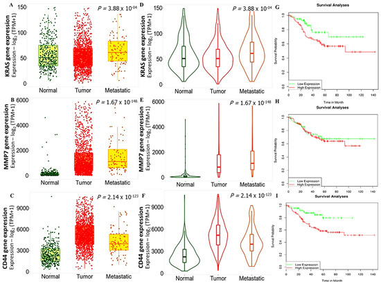 We applied the TNM plot analysis to compare expressions of the KRAS, MMP7, and CD44 genes in normal, tumor, and metastatic CRC samples from RNA-Seq data. Analytical results are presented as boxplots and violin plots. We compared the data by first using the Kruskal–Wallis test, which is a method used to test samples originally from the same distribution of specimens. The results acquired showed that increased expression levels of KRAS, MMP7, and CD44 promoted primary tumor and metastasis in CRC samples compared to adjacent normal samples (Figure 2A–C). To compare if the samples were originally from the same distribution of specimens, we used the Kruskal–Wallis test, and results showed the same p value in both boxplots and violin plots as p = 3.88 × 10−04, p = 1.67 × 10−148, and p = 2.14 × 10−123 for KRAS, MMP7, and CD44, respectively (Figure 2D,F). We further used Dunn’s test which revealed the significance of KRAS, MMP7, and CD44 expressions in promoting CRC tumor metastasis. More the Kaplan–Meier plot survival analysis showed that, high expression of KRAS/MMP7/CD44 associated with poor overall survival in CRC, this validated that the samples originated from same distribution (Figure 2G–I). with p < 0.05 considered statistically significant.