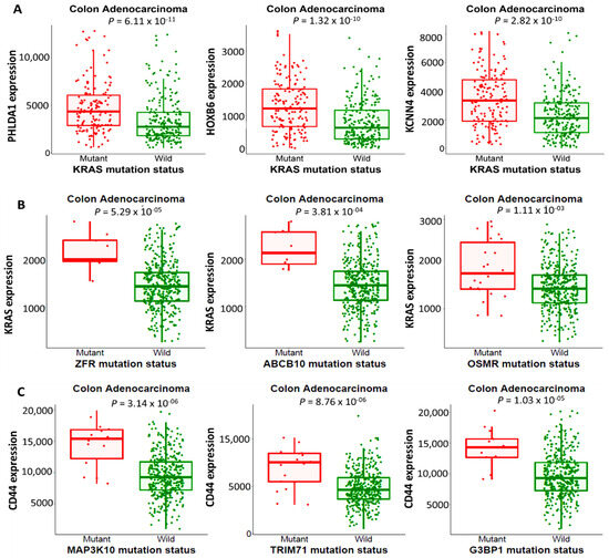 KRAS and CD44 mutations were associated with worsened clinical outcomes in colorectal cancer (CRC). (A) Associations of KRAS mutations with the top three highly expressed genes (PHLDA1, HOXB6, and KCNN4) in CRC. (B,C) The top three genes (ZFR, ABCB10, and OSMR) for KRAS and (MAP3K10, TRIM71, and G3BP1) for CD44 had stronger mutations and were associated with changes in expressions of KRAS and CD44 in CRC, with p < 0.05 considered significan.