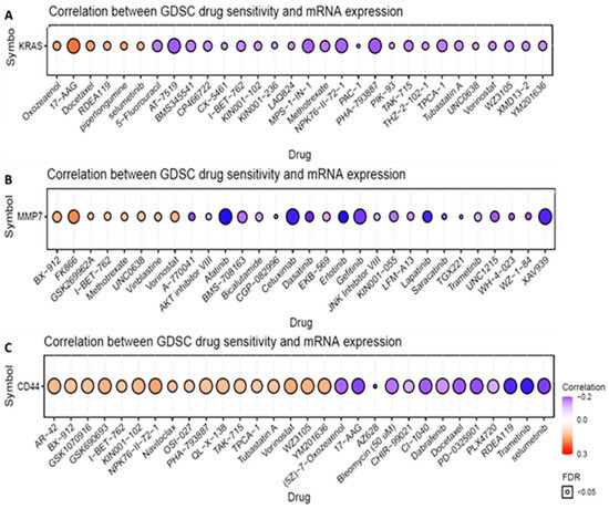 We used the GSCA to determine the drug sensitivity of KRAS, MMP, and CD44 as shown in circles (Figure 4). Correlation coefficients indicate that increased gene expression levels were resistant to the drug. Herein, high mRNA expression levels of KRAS, MMP7, and CD44 (as indicated in orange circles) were associated with drug resistance. High expressions of the KRAS, MMP7, and CD44 oncogenic signatures were potentially resistant to the drug. High expression of KRAS was demonstrated to be resistant to docetaxel, a chemotherapeutic drug [49], RDEA119, and selumetinib which are all MAPK kinase (MEK) inhibitors [50,51] (Figure 4A). In addition, increased expression levels of MMP7 and CD44 were shown to be resistant to Bx-912, which is a phosphoinositide-dependent kinase 1 (PDK1) inhibitor [52,53], navitoclax (a Bcl-2 inhibitor) [54,55], and vorinostat (a histone deacetylase (HDAC) inhibitor) [56,57] (Figure 4B,C).